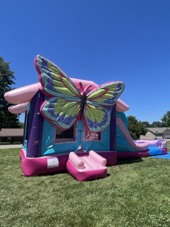 Experience the beauty of nature with our Butterfly Bliss Combo! Adorned with colorful butterfly designs, this inflatable creates a whimsical and enchanting play area that will captivate kids of all ages. The Butterfly Bliss Combo combines a spacious bounce house with a delightful slide, providing hours of fun and laughter in a magical garden setting.
