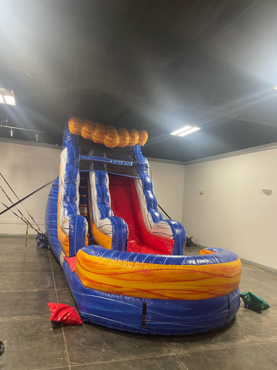 Built with safety in mind, the "Fireblast" features secure anchor points and durable, high-quality materials that ensure a smooth and safe ride for all ages. The inflated pool at the bottom provides a soft landing for riders as they soar down the slide.